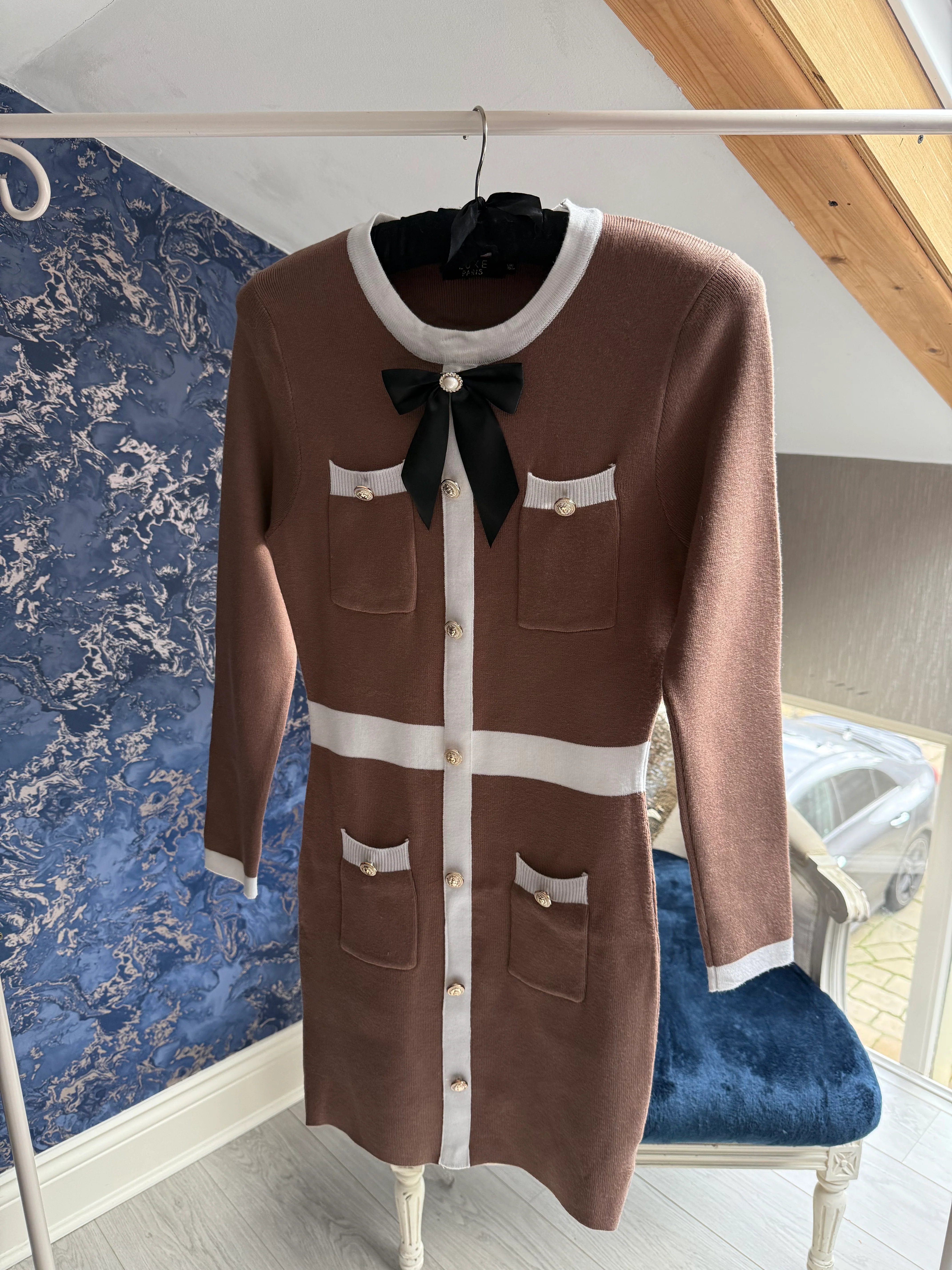 Bring serious glam to your wardrobe with this stunning long-sleeved camel knitted dress. Featuring elegant cream piping and gold military-style buttons for a chic, polished finish. The removable black satin bow with a pearl centre adds a touch of feminine sophistication.