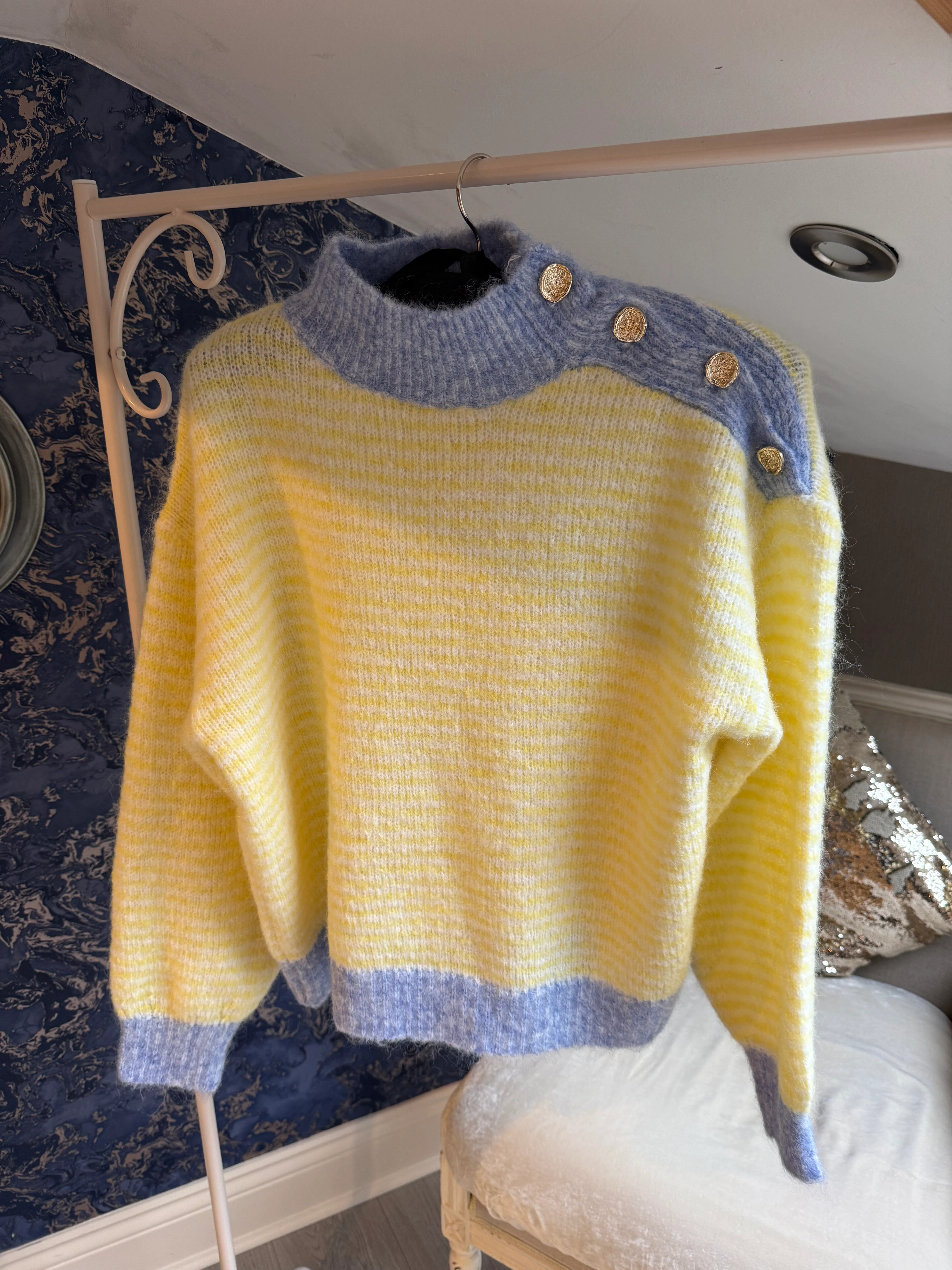 A chic, easy-to-wear knit featuring classic stripes and statement gold buttons. Designed with a round neckline and long sleeves, this jumper is finished with contrast edging for a polished touch. Soft, comfortable, and flattering, it’s a versatile piece that works just as well dressed up or down.