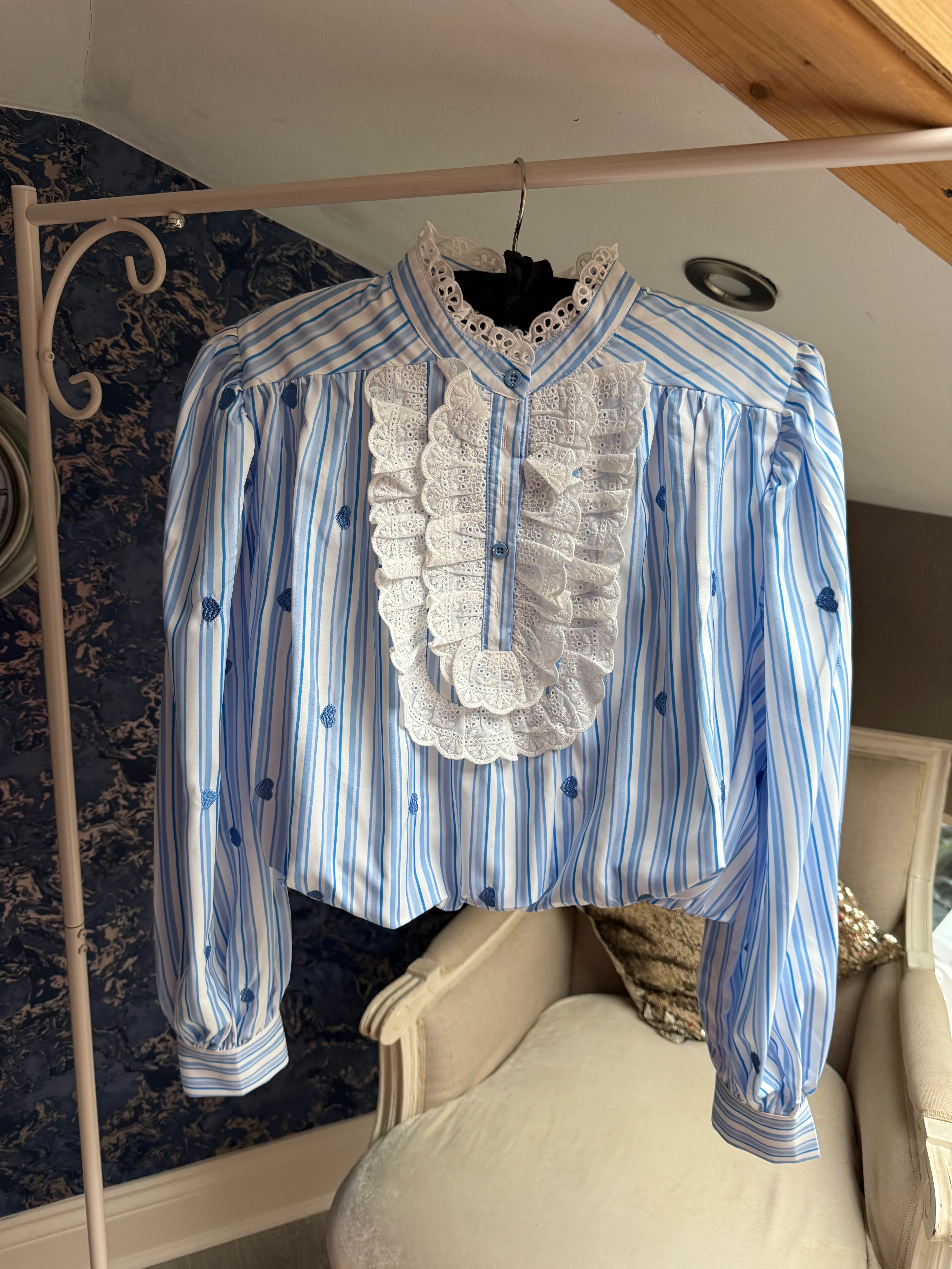Designed in classic blue and white stripes, it features beautiful blue embossed hearts throughout for the sweetest subtle detail. The standout white broderie bib front adds a fresh, feminine touch, with matching broderie trim around the neckline for extra charm.